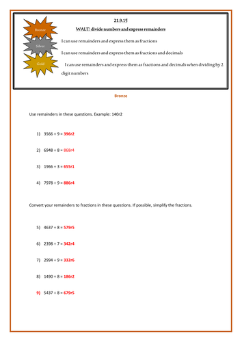Division Remainders As Fractions And Decimals Differentiated Teaching Resources